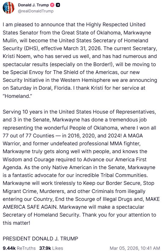 Donald Trump’s announcement that Senator Markwayne Mullin will become Secretary of Homeland Security reads less like a serious statement about national governance and more like one of his trademark campaign-style social media tirades—heavy on self-congratulation, grievance politics, and cartoonish slogans, but conspicuously light on actual policy substance. In classic Trump fashion, the announcement begins not with any explanation of the enormous responsibility of running the Department of Homeland Security, but with a rambling ode to himself: his electoral victories in Oklahoma, his “America First Agenda,” and the obligatory MAGA chest-thumping that has come to substitute for coherent governance in his administration. The Department of Homeland Security, an agency responsible for immigration enforcement, counterterrorism coordination, disaster response, cybersecurity, and border operations, is treated here not as a complex institution requiring serious administrative leadership, but as another stage prop in Trump’s endless political rally.